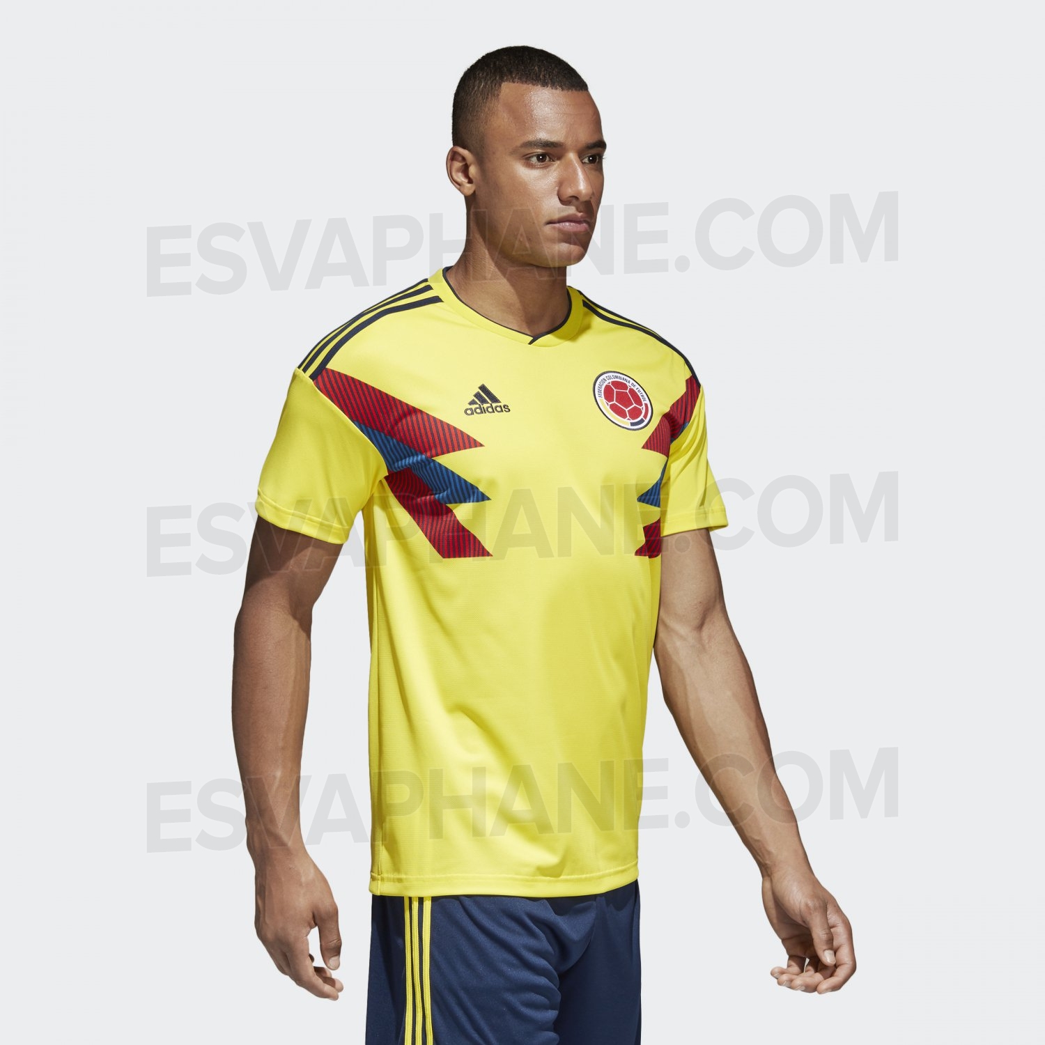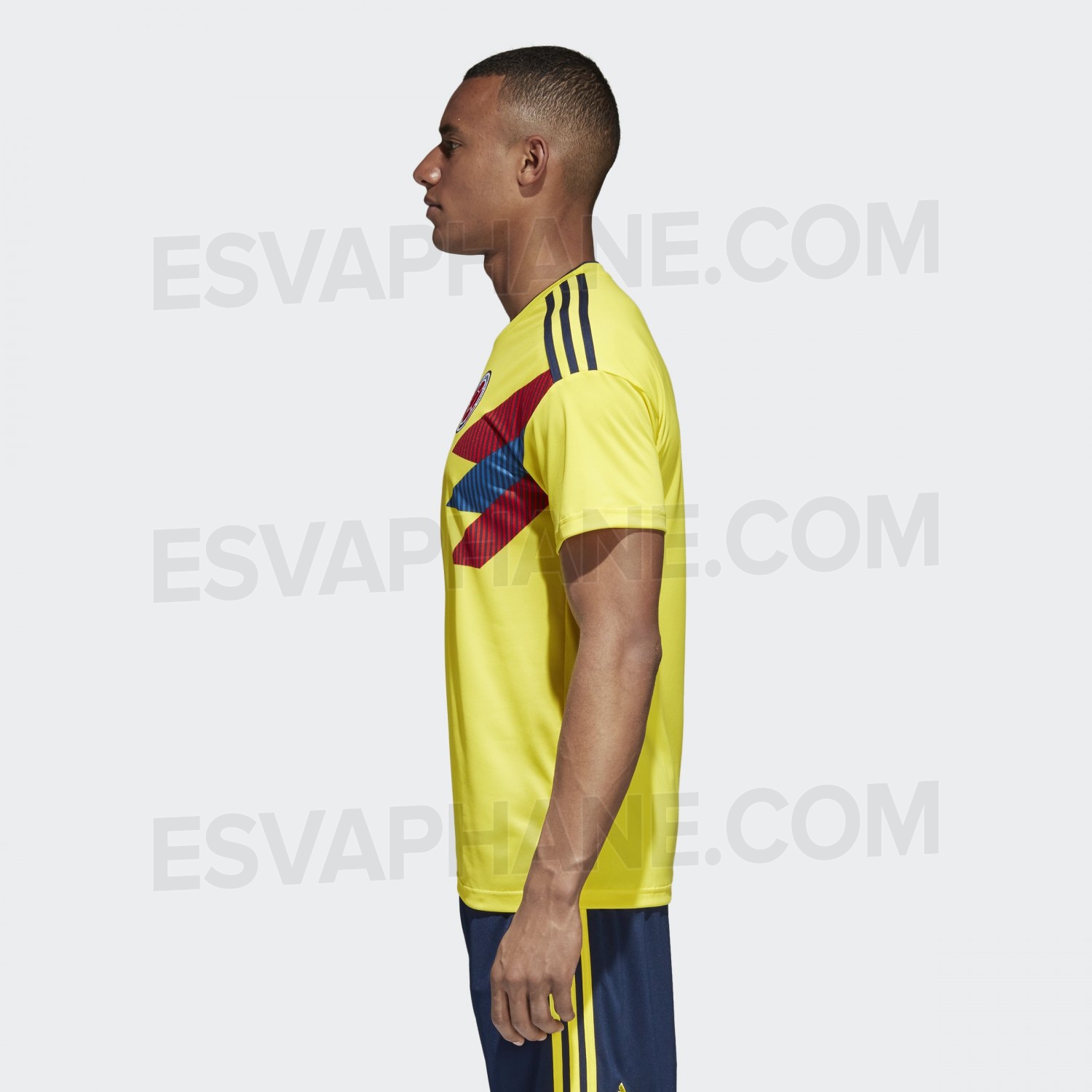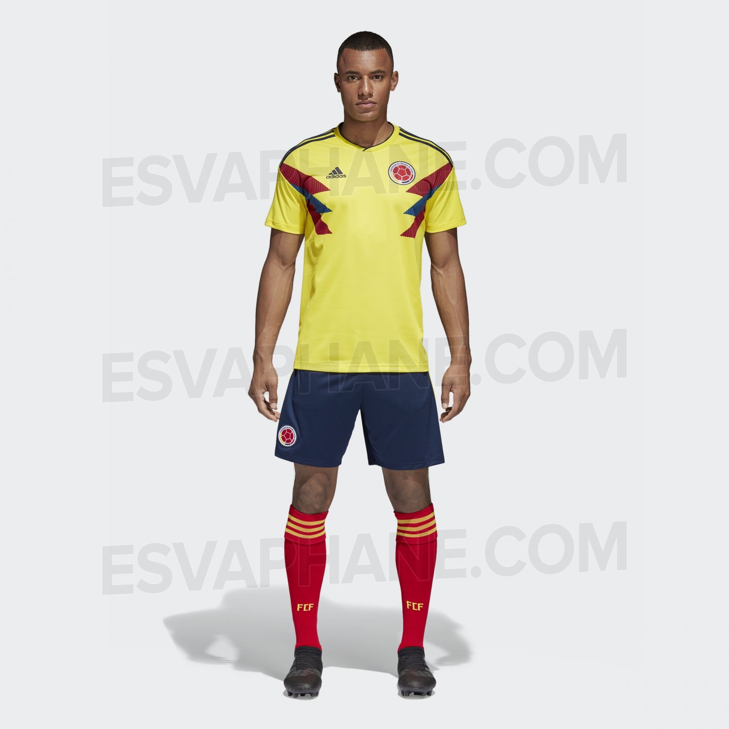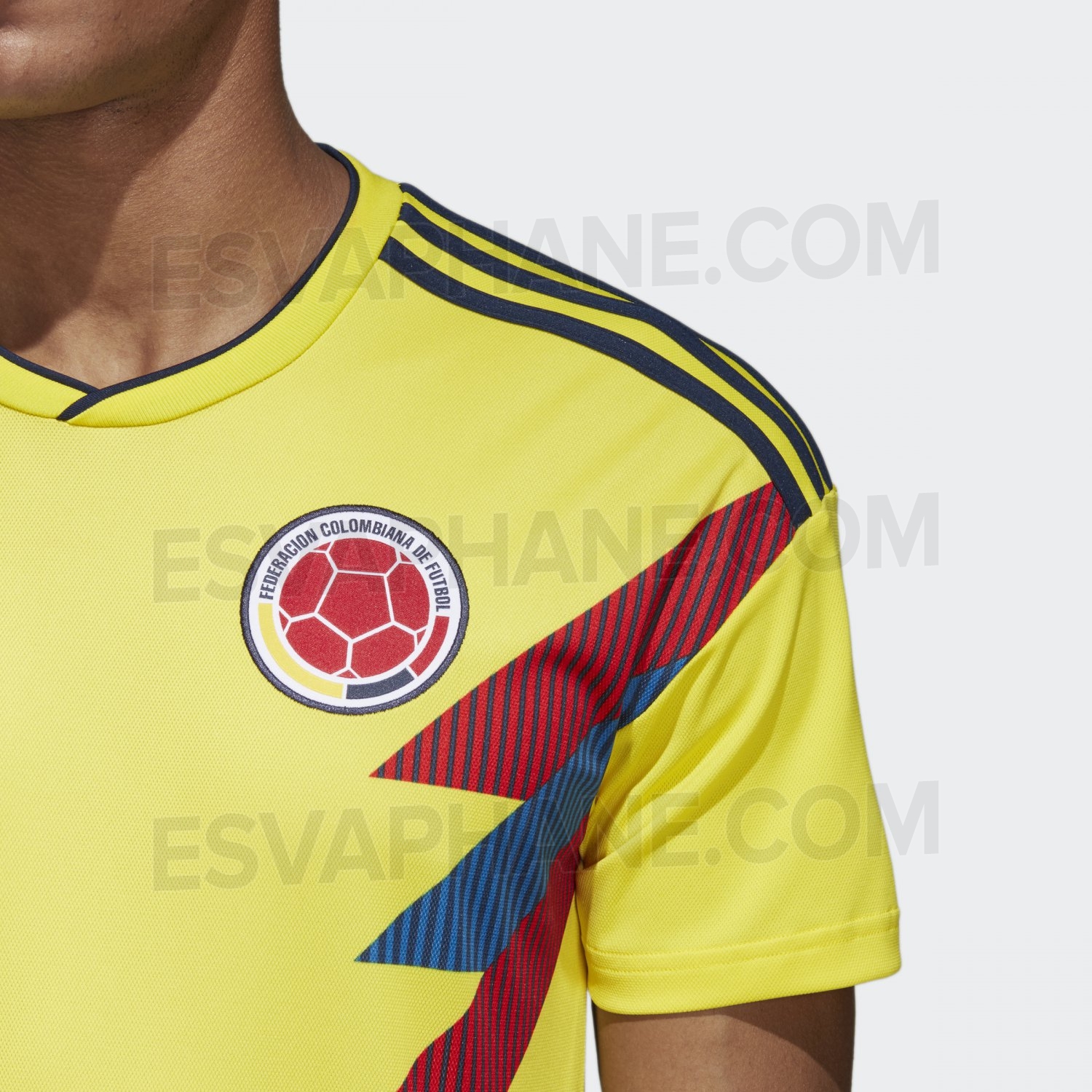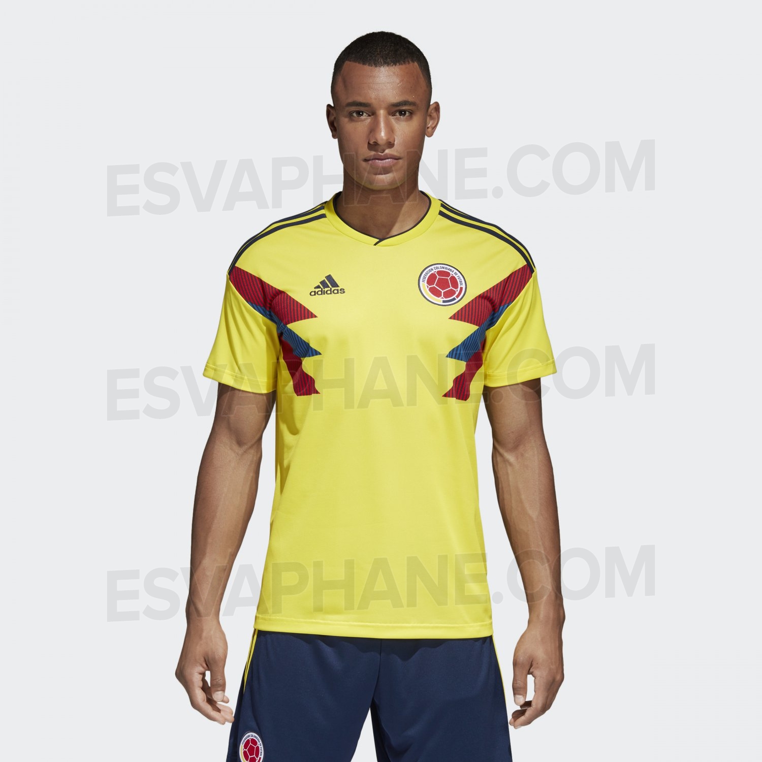 Kolombiya’nın yeni iç saha forması Güney Amerika’da sıkça kullanılan ve Kolombiya için klasikleşmiş olan bayrak temasıyla, lacivert şort kırmızı çorapla kombinlenecek.